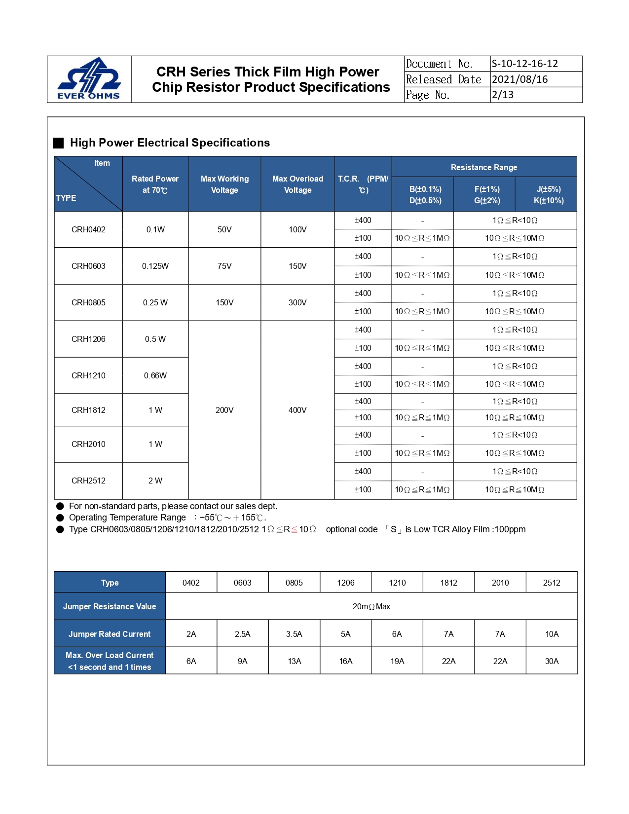 功 率:0603-1/8W、0805-1/4W、1206-1/2W、1210-1.5W、1812-1W、2010-1W、2512-2W